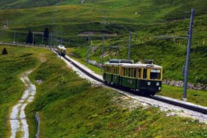 スイス 、ユングラウ鉄道の、BOB路線。標高567mのインターラーケンオスト駅から3454mのユングラウヨッホを結ぶアルプス登山鉄道。クライネ−シャイデックからJB鉄道となる。私が乗った時期は8月でアルプスに咲く花が、素晴らしかった。頂上は、寒く氷河を見ながら真冬が体験できる。電車に乗って山を見るのには、登りで左側に座ると景色が良いです。