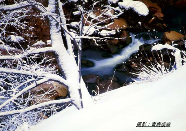 冬の渓谷に、小雪が舞う静かな朝