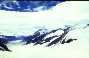 雄大なアレッチ氷河が、スフィンクステラス展望台から見える。ヨーロッパ最大の氷河、スフィンクス展望台を進むとトンネルの先に夏スキーの出来るゲレンデに出られる。